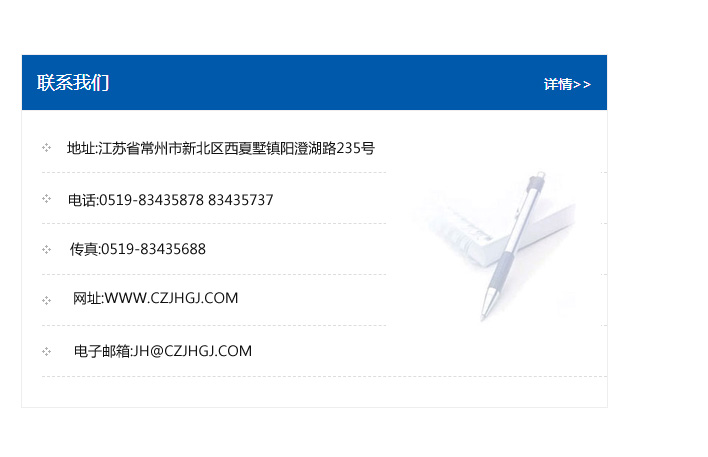 地址:常州市新北區友邦商務大廈1幢16、17層  電話:0519-85101652  傳真:0519-85112595  郵編:213022  網址:www_cz-jiayue_cn.xmfood99.com  郵箱:xiajifengaa@163.com